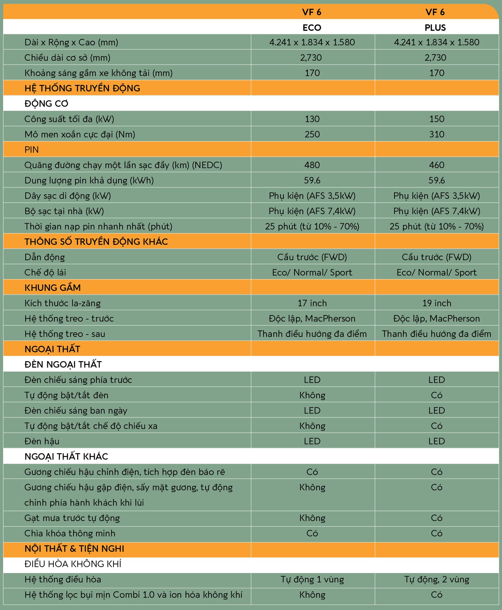 Cả hai phiên bản của VF 6 đều được trang bị pin LFP dung lượng 59,6 kW với phạm vi hoạt động tương ứng là 399 km và 381 km (theo tiêu chuẩn WLTP) cho một lần sạc đầy. Xe sử dụng động cơ điện có công suất tối đa 100 kW và 150 kW, tương ứng với mô-men xoắn cực đại 135 Nm và 310 Nm, cho cảm giác lái hứng khởi và dễ dàng đáp ứng nhu cầu di chuyển của mọi khách hàng.