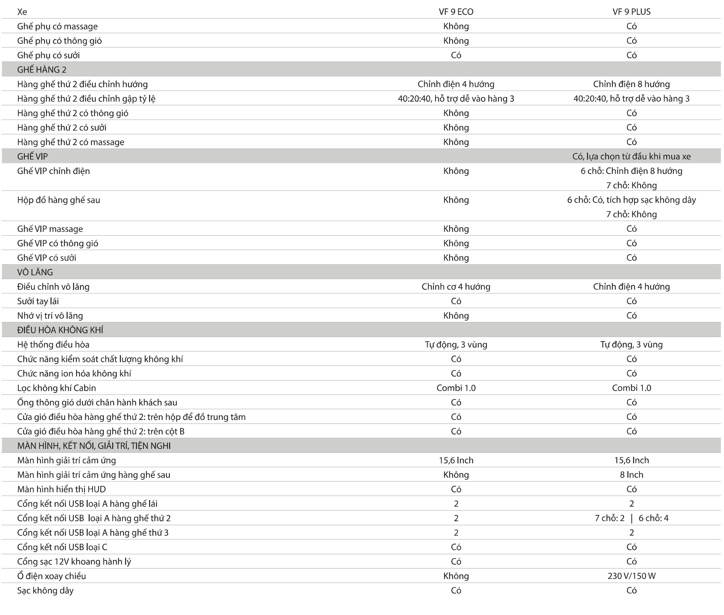 Hàng ghế trước và sau đều có khả năng chỉnh điện. Xe có tổng cộng 6 chỗ ngồi, họa tiết và cách phối màu ghế ngồi kết hợp với tựa đầu có logo V dập nổi dễ liên tưởng tới xe sang.